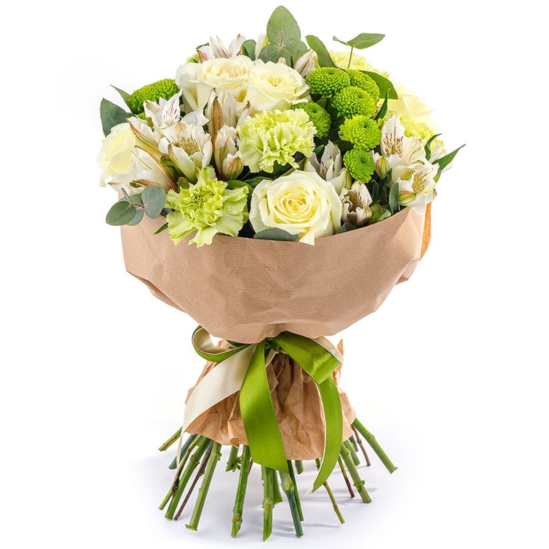 Букет состоит из 5 роз, 4 гвоздики, 3 хризантемы Сантини, 3 альстромерии, зелень, крафт, атласная лента.