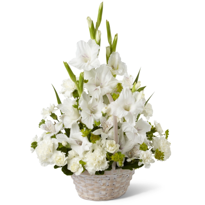 Букет состоит из 9 гладиолусов, 8 гвоздик, 4 ветки альстромерии, 6 веток кустовой гвоздики, зелень, корзина, оазис.