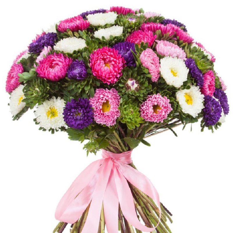 Букет состоит из MIX из 45 астр, зелень, прозрачная упаковка, атласная лента.