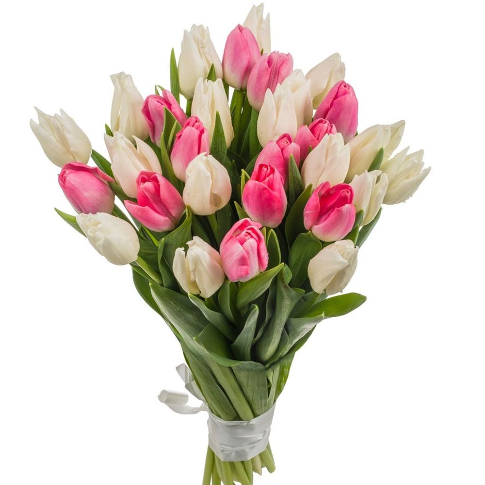 Букет состоит из 11 розовых тюльпанов, 10 белых тюльпанов, лента.