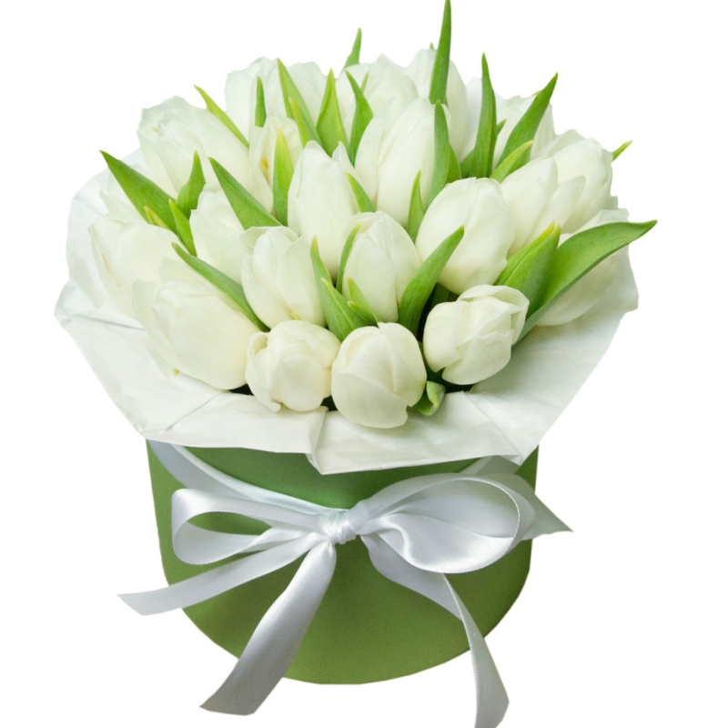 Букет состоит из 25 тюльпанов, коробка, атласная лента, оазис.