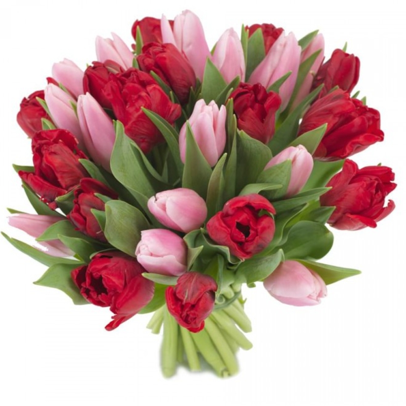 Букет из 35 красных и розовых тюльпанов