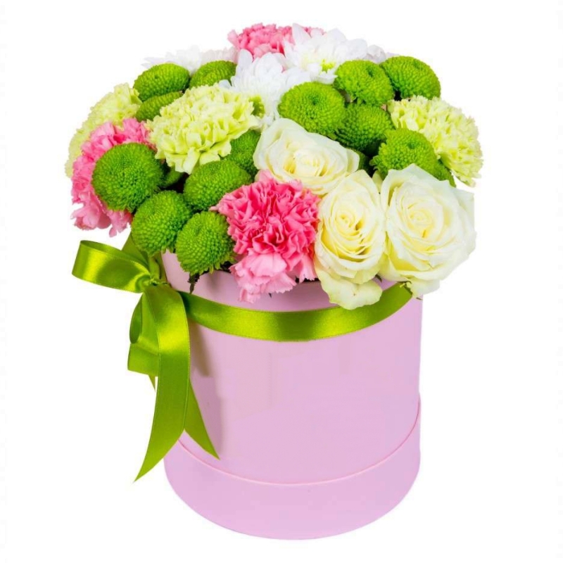 Букет состоит из 6 гвоздик, 3 розы, 4 ветки кустовых хризантем, коробка, оазис, атласная лента.
