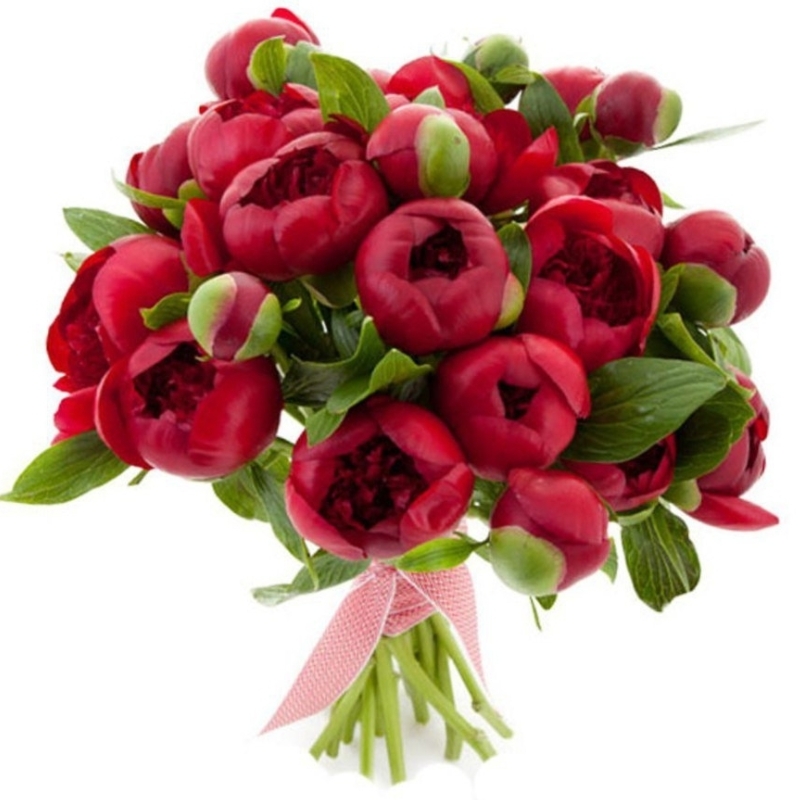 Букет состоит из 25 красных пионов, зелень, прозрачная упаковка, атласная лента.
