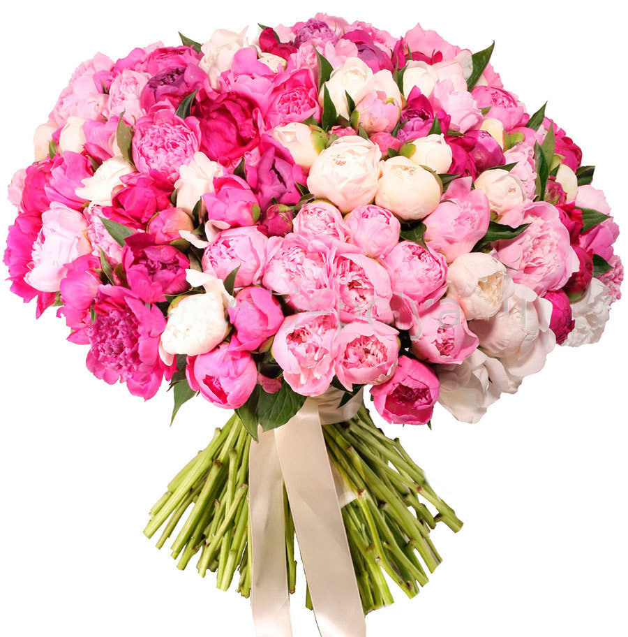 Букет состоит из 51 розовый пион, 50 белых пионов, прозрачная упаковка, атласная лента.