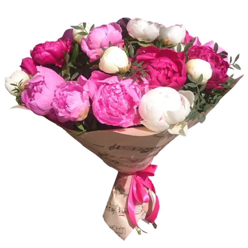 Букет состоит из MIX из 17 пионов, зелень, крафт, атласная лента.