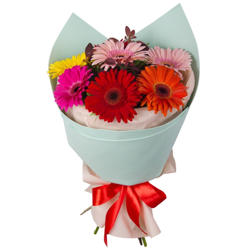 Букет состоит из MIX из 7 гербер, красивая упаковка, атласная лента.