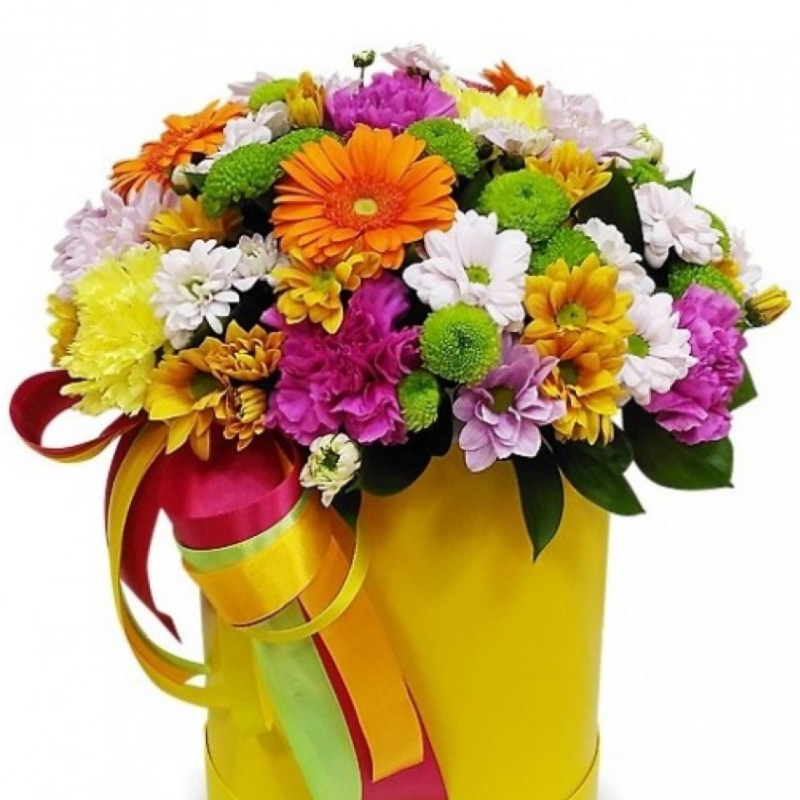 Букет состоит из 7 гвоздик, 3 гербера, 5 хризантем Сантини, 7 хризантема кустовая, рускус, коробка, оазис, атласная лента.