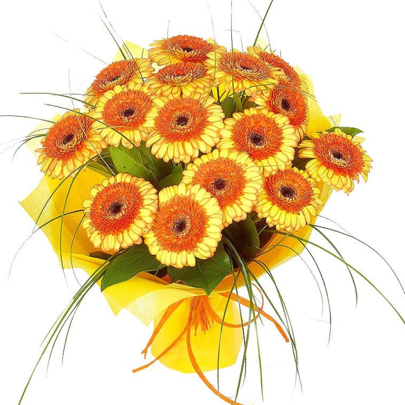 Букет состоит из 15 желтых гербер, салал, берграсс, красивая упаковка, атласная лента.