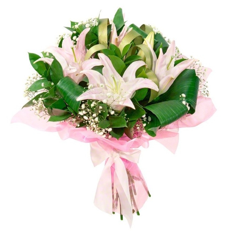 Букет состоит из 3 розовые лилии, 6 гипсофила, аспидистра, красивая упаковка, атласная лента.