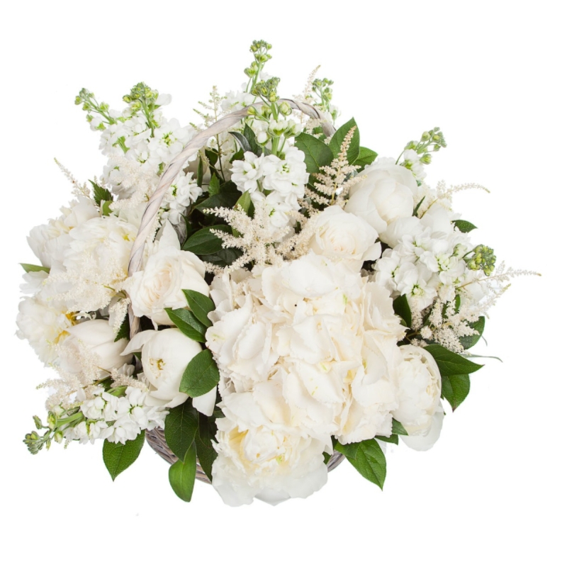 Букет состоит из 1 гортензия, 7 пионов, 5 роз, 5 веток маттиолы, 9 астильба, зелень, корзина, оазис.