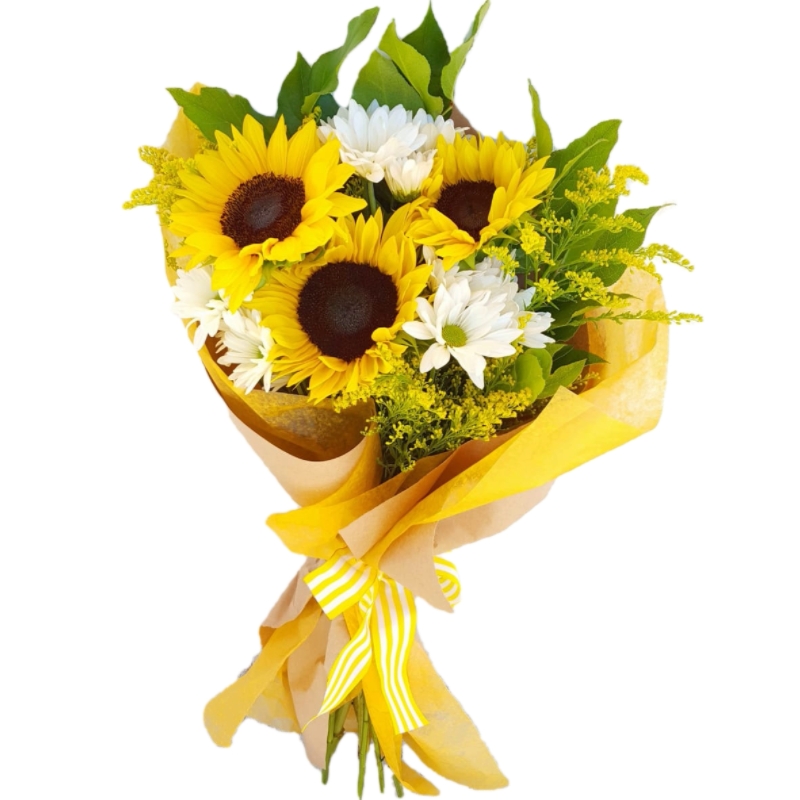 Букет состоит из 3 подсолнуха, 3 ветки хризантемы, декоративная зелень, красивая упаковка, атласная лента.