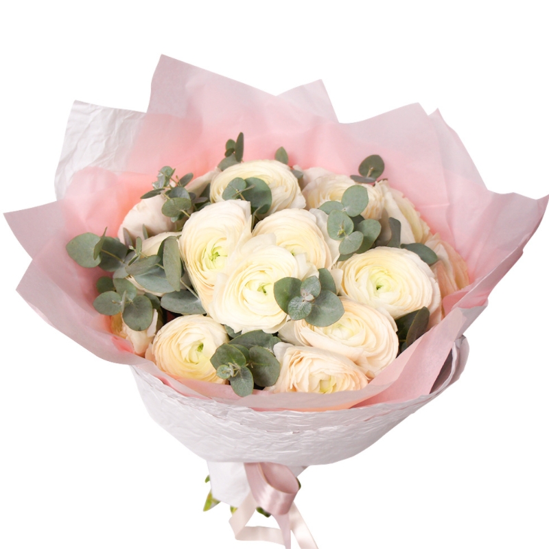 Букет состоит из 19 ранункулюсов, эвкалипт, крафт, атласная лента.