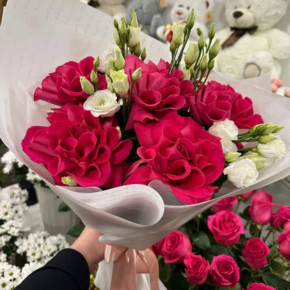 Букет из французских роз с эустомой — это изысканное и утонченное сочетание, где пышные французские розы контрастируют с нежными эустомами. Этот букет прекрасно подходит для особых случаев, выражая восхищение и нежность.