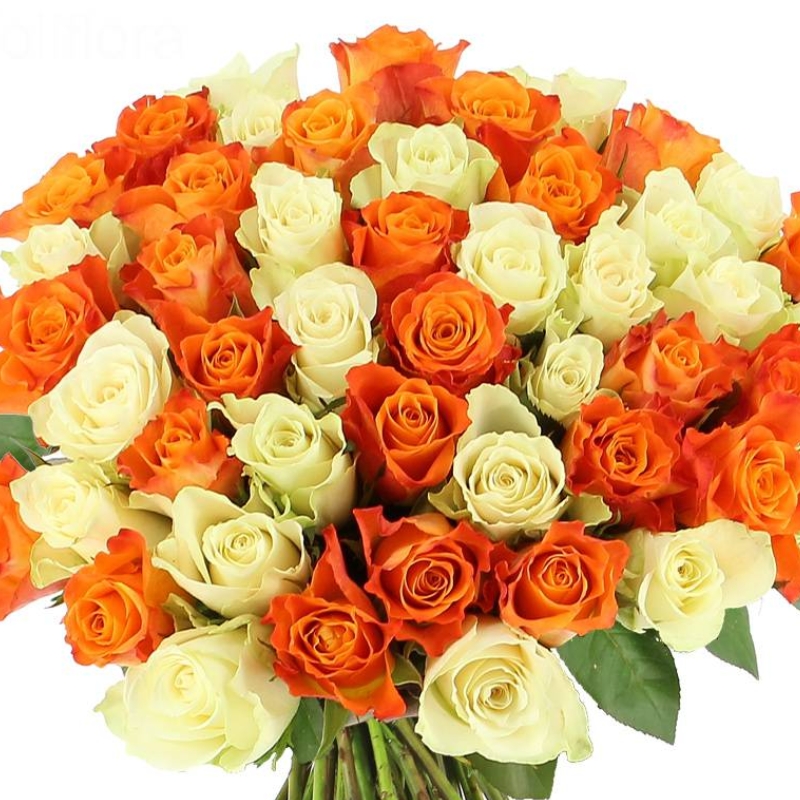 Букет состоит из 26 оранжевых роз, 25 белых роз, прозрачная упаковка, атласная лента.