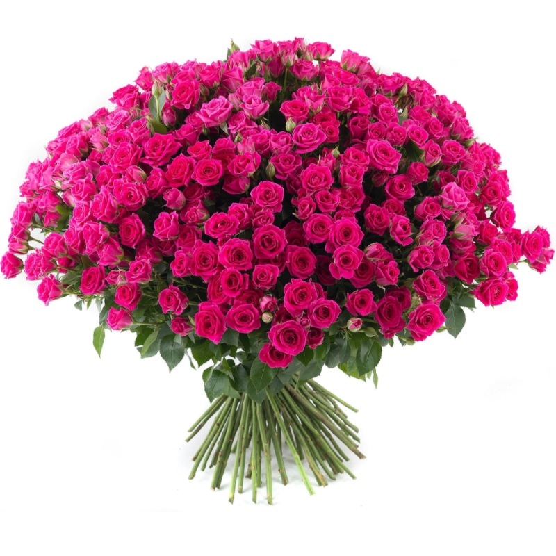 Букет состоит из 101 ветка малиновой кустовой розы, прозрачная упаковка, атласная лента.