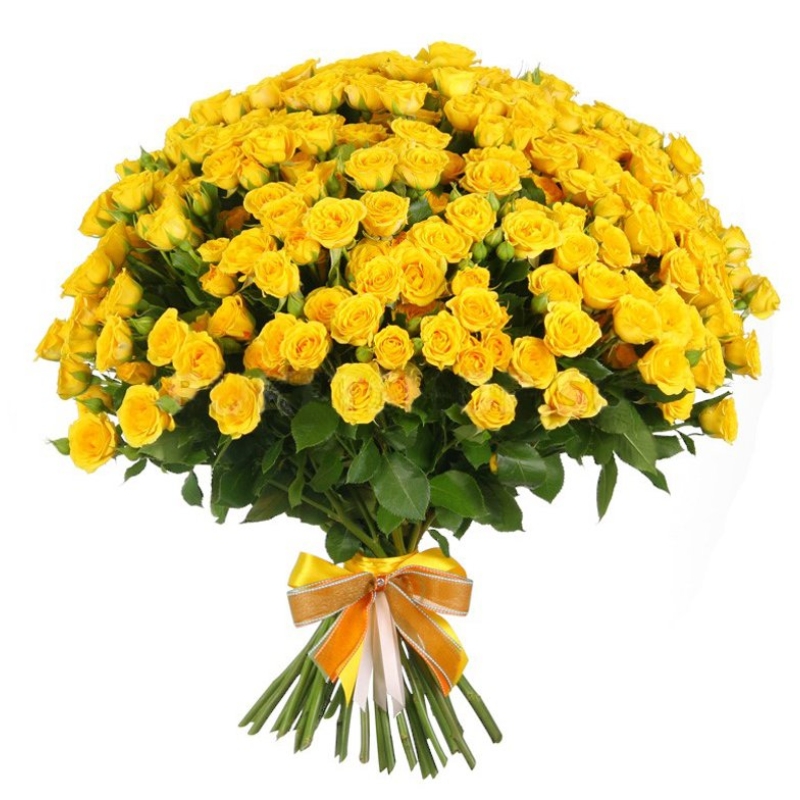 Букет состоит из 51 желтая кустовая роза, прозрачная упаковка, атласная лента.