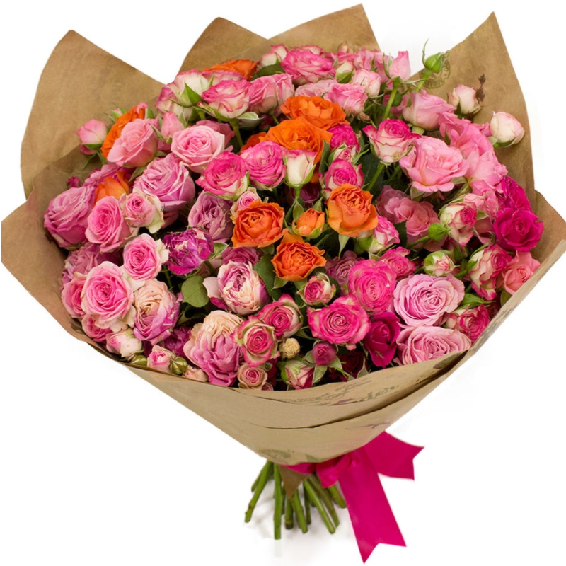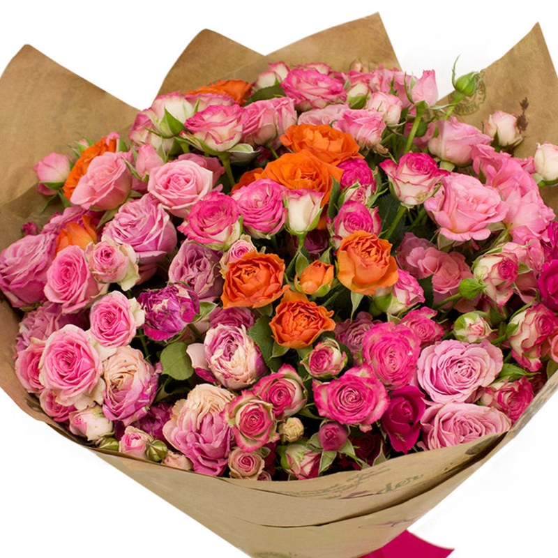Букет состоит из MIX из 19 кустовых роз, крафт, атласная лента.