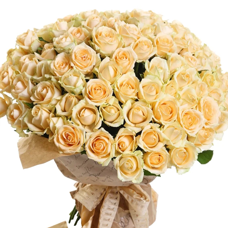 Букет состоит из 101 кремовая роза, крафт, атласная лента.